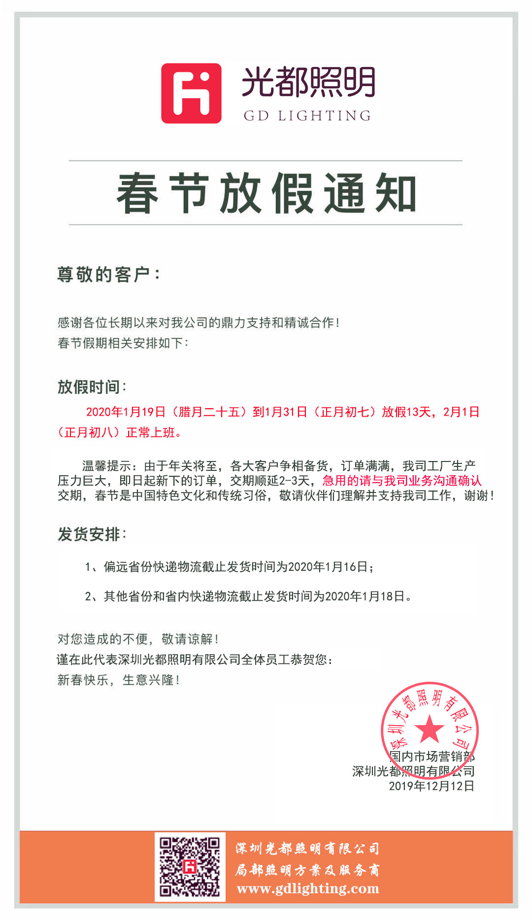 光(guāng)都(dōu)照(zhào)明(míng)2020年(nián)春節放(fàng)假通(​tōng)知(zhī)