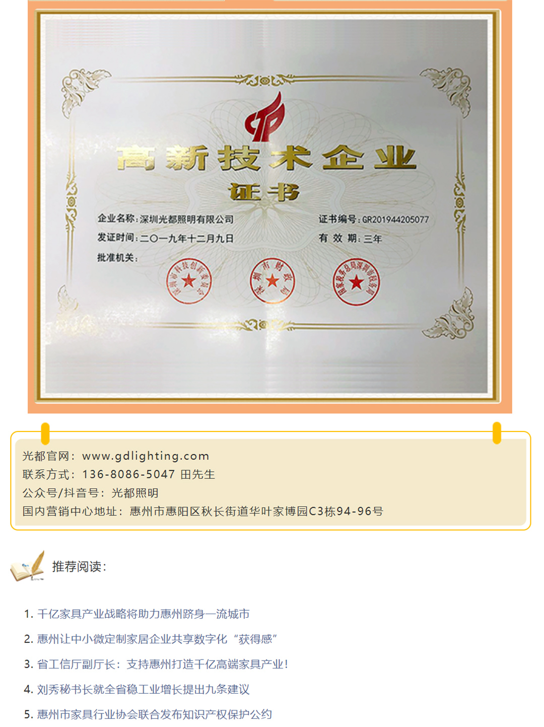 【光(guāng)都(dōu)簡介】深圳厚屹照明有限公司系全球局部照(zhào)明(míng)定制(zhì)方案和(hé)服務提供商,國(guó)家(jiā)高(gāo)新技(jì)術(shù)企業(yè),智能(né∑ng)健康照(zhào)明(míng)領航者,拎包、整裝和(hé)全屋定制(zhì)燈光(guāng)專家(jiā)。惠州光(guāng)都(dōu)智能(néng)≥科(kē)技(jì)有(yǒu)限公司是(shì)光(guāng)都(dōu)照(zhào)明(míng)在惠州的(de)生(shēng)産基地(₩dì),專注家(jiā)具照(zhào)明(míng)16年(nián),擁有(yǒu)LED局部照(zhào∞)明(míng)全産業(yè)鏈,主要(yào)從(cóng)事(shì)LED燈具、驅動電(diàn)源、感應開(kāi)關•、紫外(wài)線殺菌燈和(hé)智能(néng)配件(jiàn)的(de)研發和(hé)生(shēng)産,産品暢銷全球60多(duō)個(gè)國(guó)家(jiā)和(hé)•地(dì)區(qū),擁有(yǒu)200多(duō)項專利和(hé)1000多(duō)份各類資質證£書(shū),通(tōng)過ISO9001:2015質量管理(lǐ)體(tǐ)系認證,為(wèi)惠州市(shì)家(jiā)具行(xíng)♥業(yè)協會(huì)專業(yè)定制(zhì)委員(yuán)會(huì)副會(huì)長(cháng)單位。