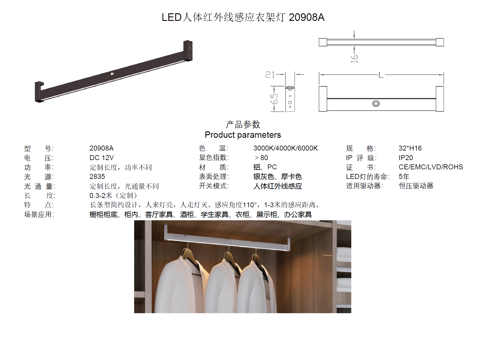 锂電(diàn)池LED人(rén)體(tǐ)紅(hóng)外(wài)線感應衣架燈 20908B
