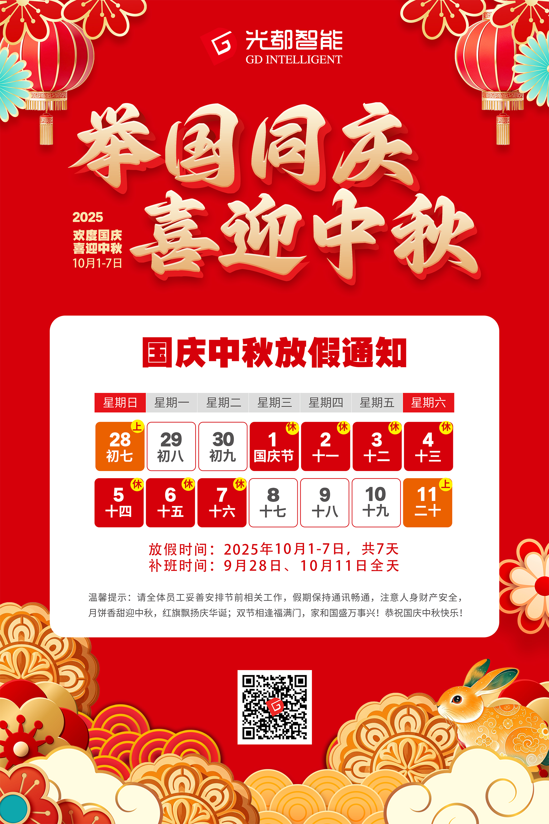 #光(guāng)都(dōu)智能(néng) 恭賀祖國(guó)母親76周年(nián)華誕!恭祝新老(lǎo)夥伴朋(péng)友(yǒu)家(jiā)人(rén)們國(guó)慶中秋雙節快(kuài)樂(yuè)!