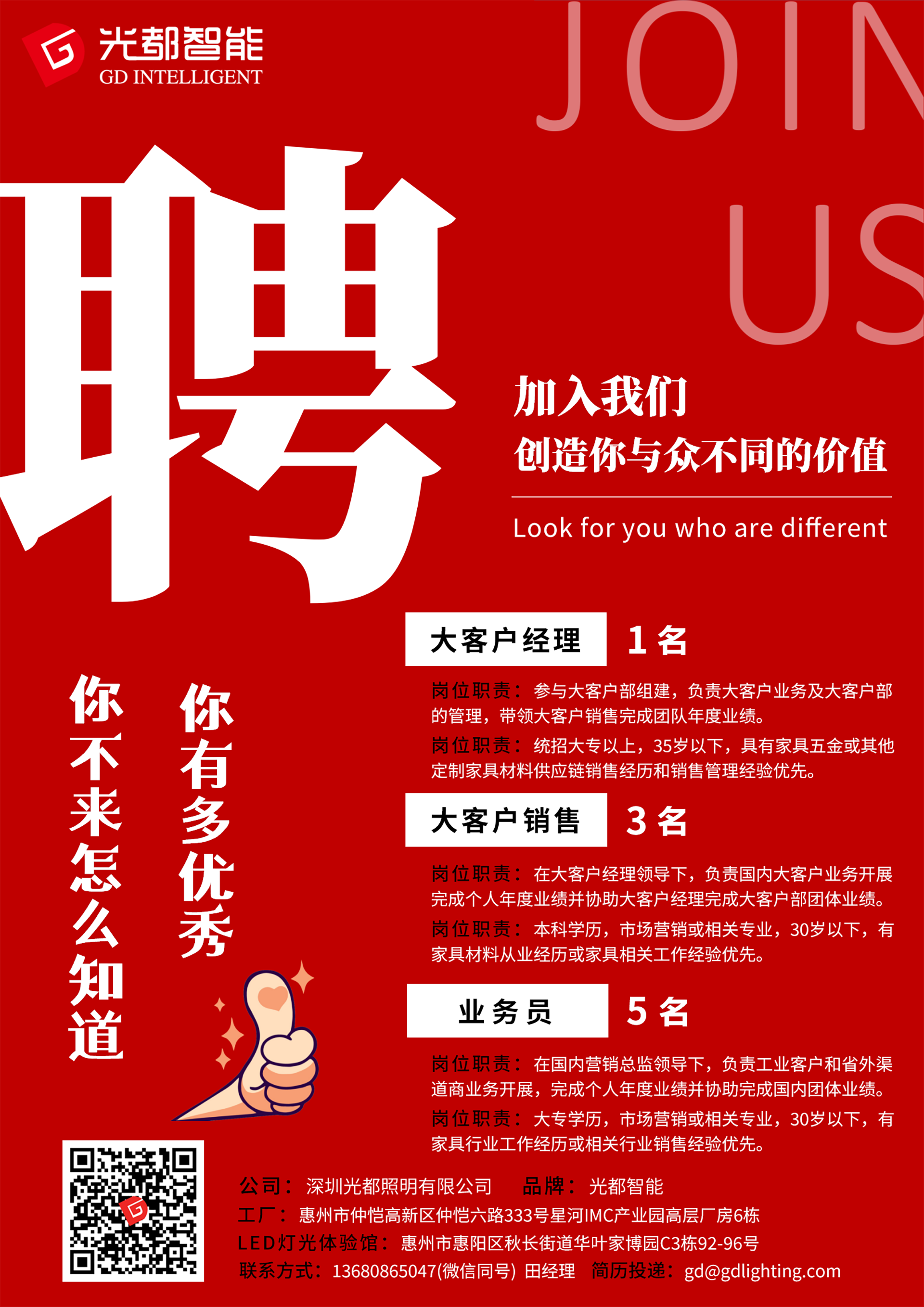 光(guāng)都(dōu)2023春季招聘開(kāi)啓,廣納英才,誠邀加盟,光(guāng)都(dōu)秉承開(kāi)放(fàng)包容,渴望您的(de)才華,欣賞您的(de)特點,歡迎您↔的(de)加入!光(guāng)都(dōu)國(guó)內(nèi)業(yè)務高(gāo)速發展,需要(yào)您的(de)幫助,在光(guāng)都(dōu)也(yě)一(yī)定可(kě)以實現(xiàn)您的(de)價值和(hé)夢想!