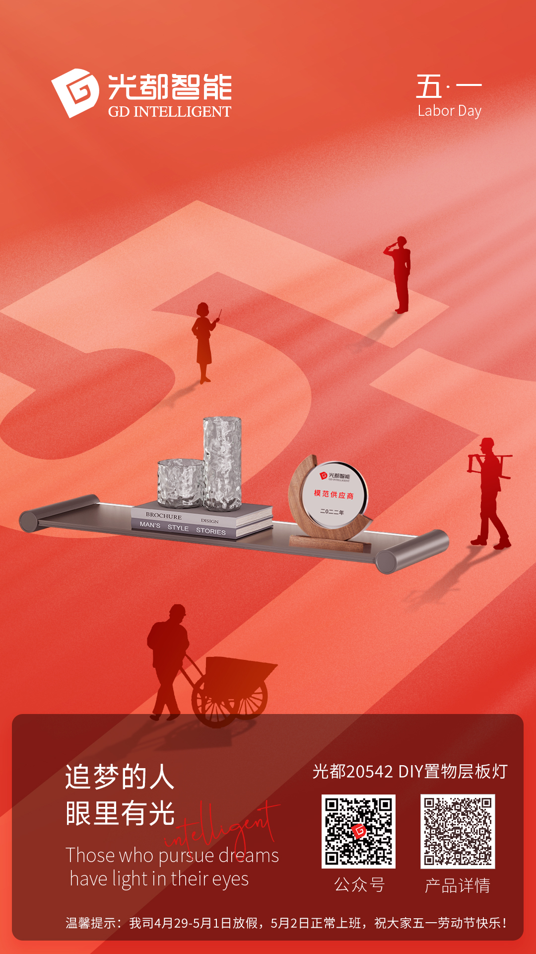 溫馨提示:我司4月(yuè)29-5月(yuè)1日(rì)休假,5月(yuè)2日(rì)正常上(shàng)班,祝大(dà☆)家(jiā)五一(yī)勞動節快(kuài)樂(yuè)!光(guāng)都(dōu)新品20542 DIY置物(wù)層闆燈緻敬勞動,五月(yuè)優費(f"èi)上(shàng)樣!